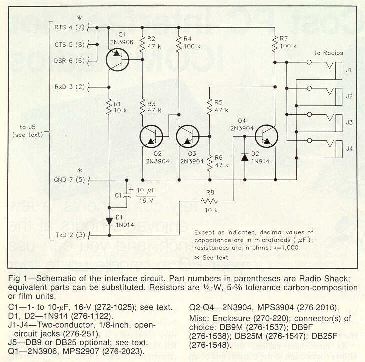 The parts are flexible and any small signal PNP and NPN transistors can be used. About the only part that should not be changed is C1, the 10 uF capacitor. The pin numbers are for a DB-25 and the bracketed numbers are for a DB-9.